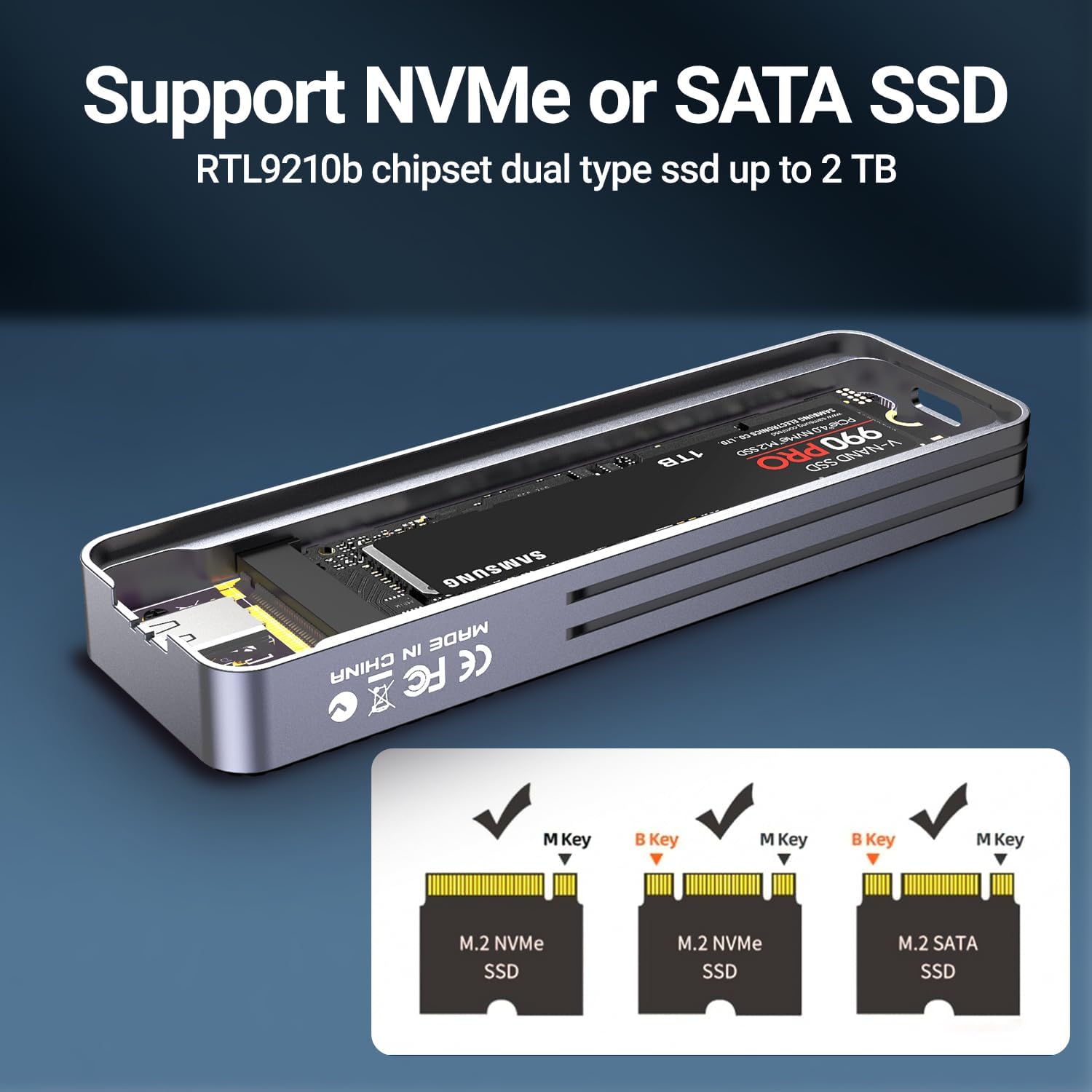 - The m.2 nvme sata ssd enclosure adapter no extra power source required; it is plug-and-play compatible. It comes with a USB C to C and a USB A to C data cable, as well as a complimentary hanging rope.