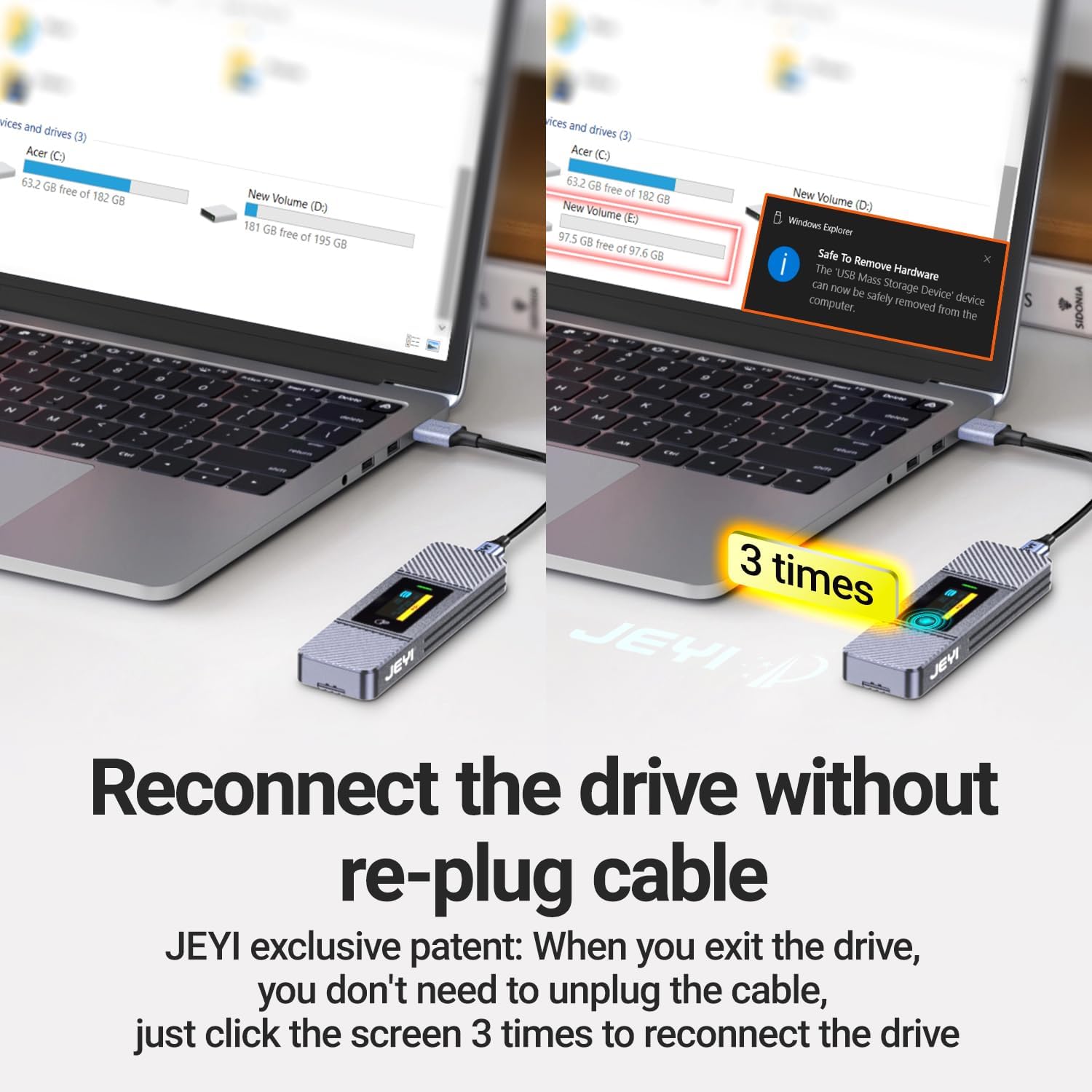 - The JEYI m.2 external enclosure improved heat dissipation, the m.2 usb enclosure features an aluminum alloy CNC shell with multiple grooves on the surface matched with thermally conductive silicon pads to maximize cooling capabilities.